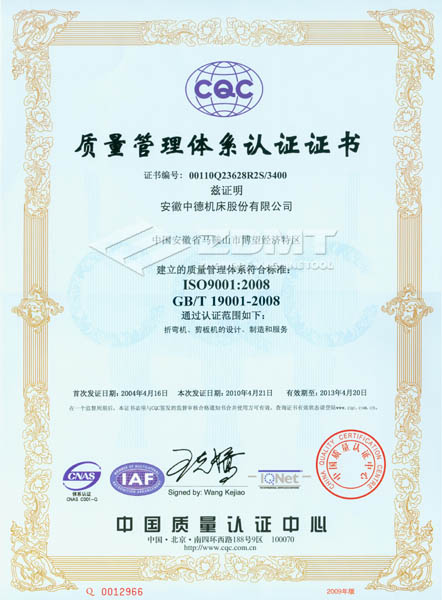 2010年4月,我公司順利通過(guò)了ISO 9001:2008版換證復(fù)審,獲得認(rèn)證證書(shū)(證書(shū)編號(hào):00110Q23628R2S/3400)。在此次復(fù)審過(guò)程中,中國(guó)質(zhì)量認(rèn)證中心(CQC)對(duì)我公司的質(zhì)量體系運(yùn)行情況進(jìn)行了全方位嚴(yán)格審核,并對(duì)中德公司質(zhì)量管理工作給予了充分的肯定。